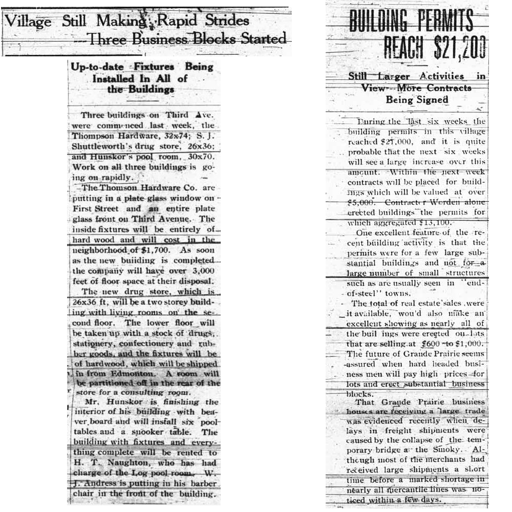 The railway reached Grande Prairie March 22, 1916, and in the next six weeks the value of building permits issued by the village was $21,200. An earlier article on May 2, 1916 described 3 new business blocks under construction with plate glass windows and hardwood fixtures. As an “end of steel” village, Grande Prairie was experiencing rapid growth. The pioneers of 1916 would have been dumbfounded at the total of building permits issued to the end of march 2014 – $32,384,052!