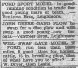 It’s interesting that right next to this Ford ad, is an equal-sized one for draft horses. And 15 years later there were two ads in the same “Swap and Barter” section of the classified ads, offering to trade Ford cars for horses.