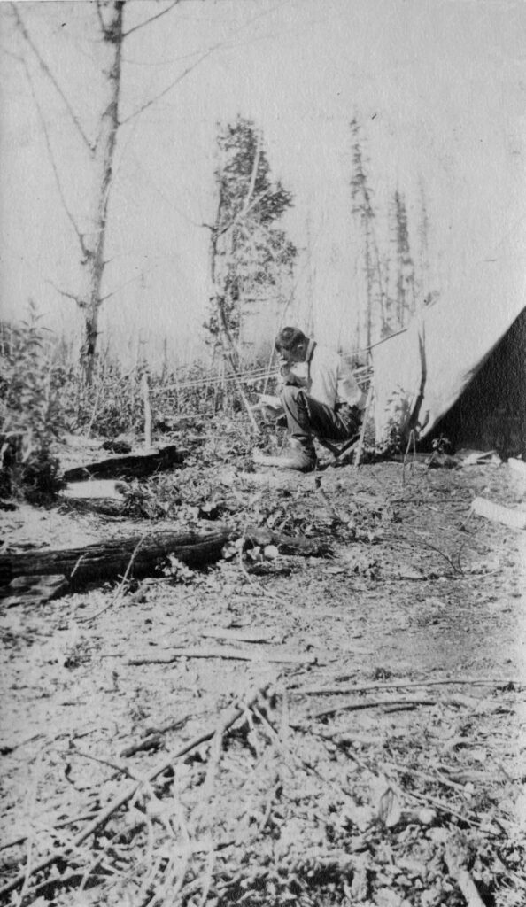 Above photograph: H.P. Keith sitting in front of his tent, reading, ca. 1915 (SPRA 282.13, cropped from original)