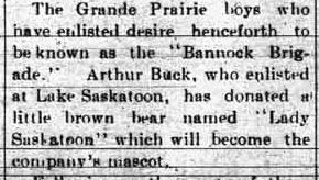 When Arthur Buck enlisted in Lake Saskatoon in 1915, he donated a little brown bear – who was dubbed ‘Lady Saskatoon’ – for the company’s mascot. Unfortunately, no mention has been found of the little bear’s war experience.