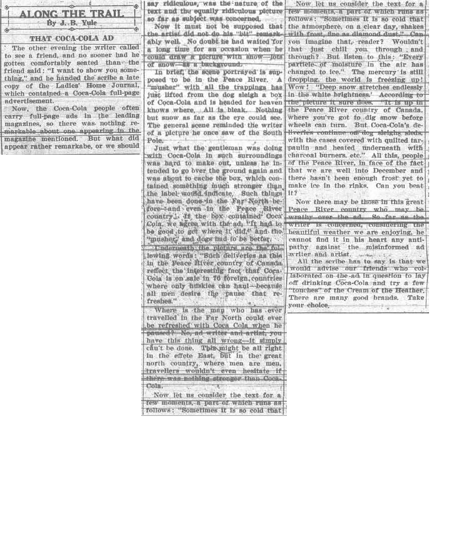 In 1929 Coca-Cola put out an ad about the Peace Country that has one man upset. I would dearly like to see the ad that the writer is describing. The article as well as the newspaper can be found here.