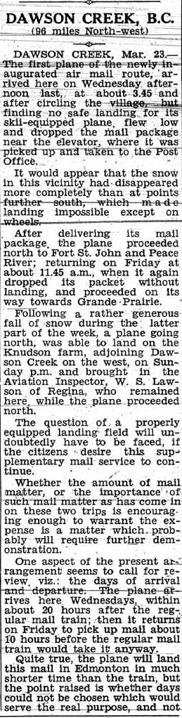This week’s item from March 26, 1938, tells about air mil service to Dawson Creek. The problem was, the planes often couldn’t land, so they dropped the mail bags out of the plane and I guess, hoped someone would pick them up and take them to the Post Office. Gives a whole new meaning to the term “mail drop”!