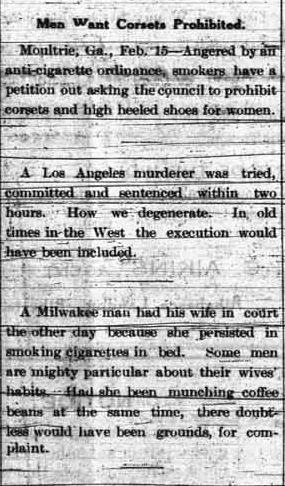 Other than area news and who was in or passed through Grande Prairie there was apparently little of note going on this week in 1914! When there was little village news, the paper used items received by telegraph to fill up the front page. Wry humor is a good approach to these odd tidbits from the U.S. which appeared in the March 3, 1914 paper. One startling headline reads “Men Want Corsets Prohibited”. It’s not hard to imagine homesteaders and villagers shaking their heads at the antics far to the south.