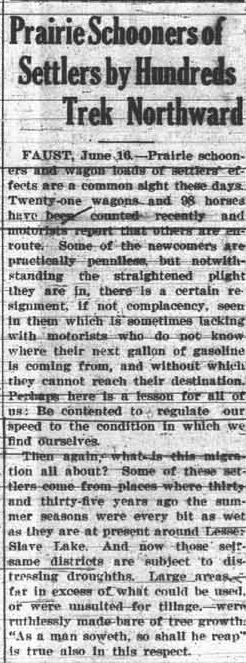 An unusual sight around Faust in June 1931 was prairie schooners and wagon loads of settlers effects. 21 wagons and 96 horses were counted by motorists on the roads. Land had been reserves across the Little Smoky River south of Falher for settlers from the drought-stricken areas in the south. By 1935 the land had been opened up for general settlement because not as many people came as was expected.