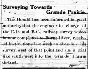 A short item on the back page of June 23, 1914 was an early indication that a rail line would be built to Grande Prairie instead of heading west to the B.C. border. Settlers had taken up land on the Grande Prairie anticipating that the C.N.R would fulfill its intention to build north from Sangudo into the area. A debate at the House of Commons in March of 1915 concluded that  if the C.N.R could not complete construction of its line to Grande Prairie, then the E.D. & B.C. Railway should construct a branch south from its main line. So the strategy of E.D. & B.C. builder J.D. McArthur to reach the B.C. border and link the Pacific Great Eastern Railway near Pouce Coupe was altered by the political and economic realities of a need to provide railway service to the widely settled open and fertile lands on the Grande prairie south of the E.D. & B.C. mail line. (some information gathered from Atlas of Alberta Railways – North Alberta Railways).