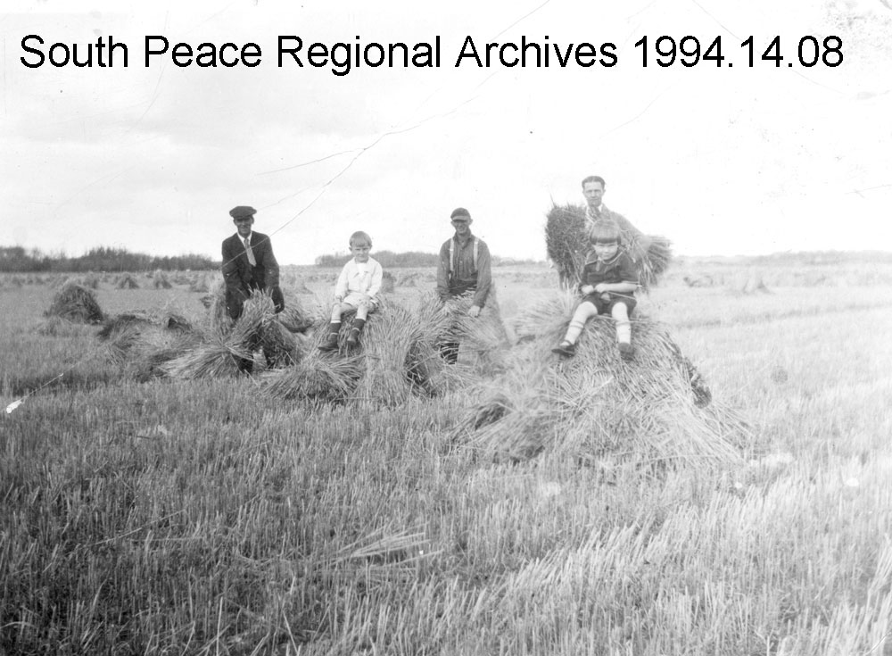 Nels Carlson, Howard Gummer, Ed Gummer, Mr. Grover (teacher at Chatham) and Jean Gummer taking a break in a field of stooked grain.c.1926