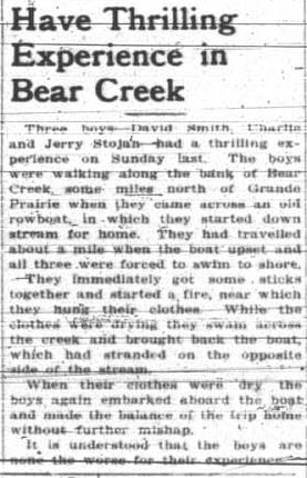 While local Boy Scouts were having “the time of their lives” at a big jamboree in Edmonton, some other boys were having a boating adventure on Bear Creek. Early in May, I would think the water would have been pretty cold, but they showed resourcefulness in dealing with the situation. Maybe they were Boy Scouts who didn’t make the trip to the jamboree; they certainly acted true to the motto, “Be Prepared.”