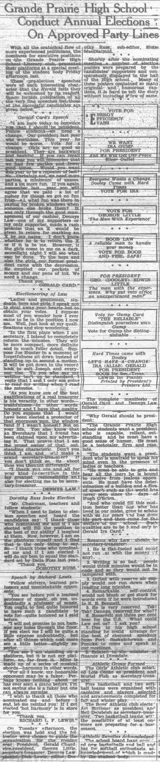 This article provides some respite from all the electioneering going on for the federal election in October.  It consists of the speeches of the winning candidates in the elections of the Grande Prairie High School Literary Club in 1933.  They are lighthearted and a bit silly, and I am sorry the paper wasn’t able to publish the speeches of all the candidates.