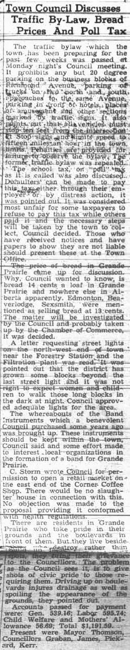 The price of bread seems like an odd issue to concern Town Council, but they also dealt with angle parking on main street, new street lights in the north end, and the whereabouts of band instruments purchased by council several years before. Also in that paper was a special notice from Canadian Utilities concerning static electricity which shocked people in their cars during a major dust storm. It must have been some storm…
