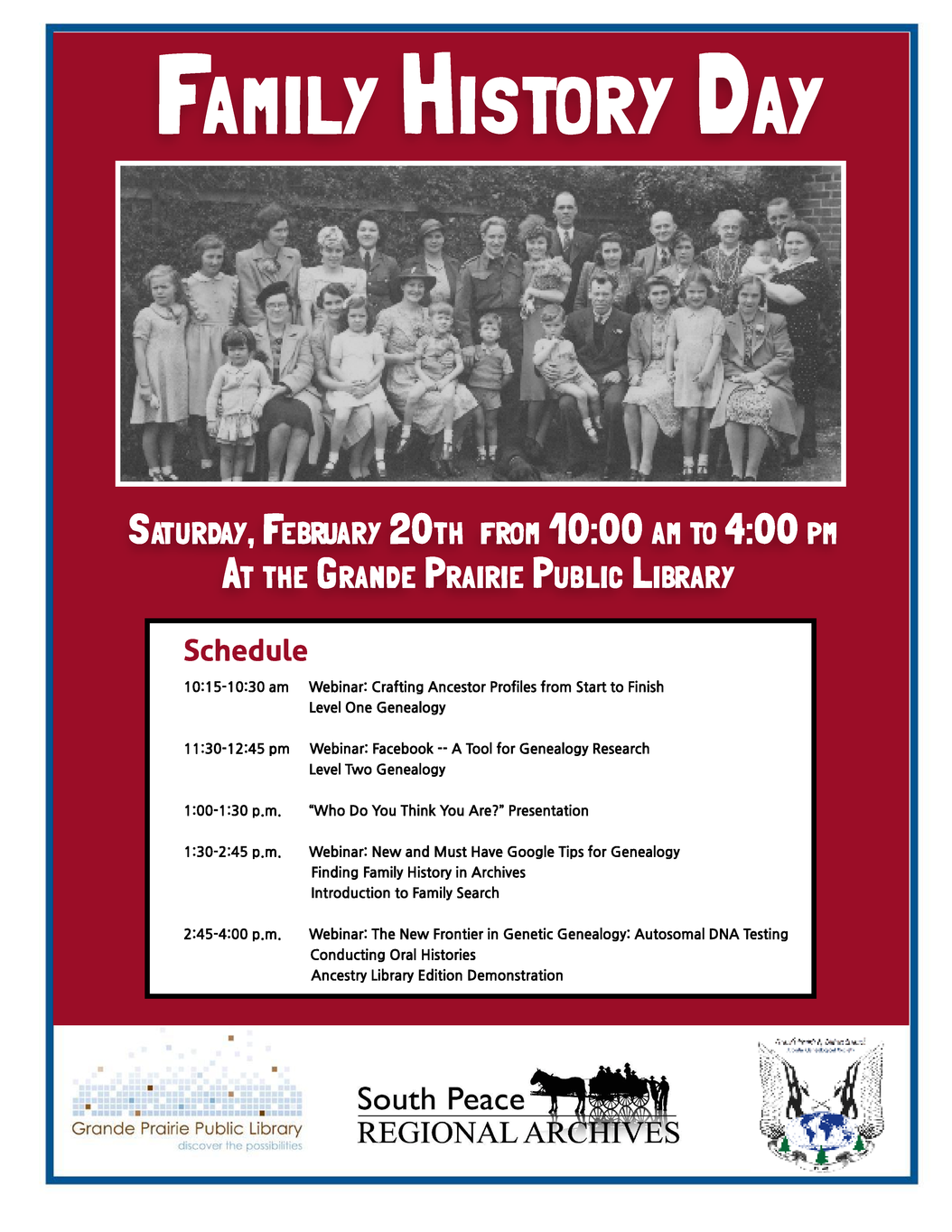 The fourth annual Family History Day will take place on Saturday, February 20th, 2016, from 10 am to 4:30 pm at the Grande Prairie Public Library (9839-103 Avenue).