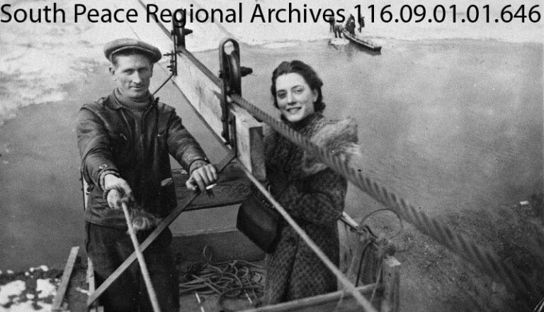 We’ve posted about ice boat runaways, ice carnivals, and cutting ice, but this 1939 report from Pipestone Creek about people crossing the Wapiti River when there was three feet of water over the ice takes the cake! An item following this report says that an $8 basket to cross the river on the ferry cables could save a life during the dangerous spring and fall. A bridge wasn’t built over the Wapiti until 1958, and it was south of Grande Prairie. The Wembley ferry operated until 1970, but winter crossings were still on the ice for many years, with crossings during the spring thaw the most hazardous.