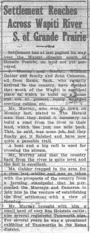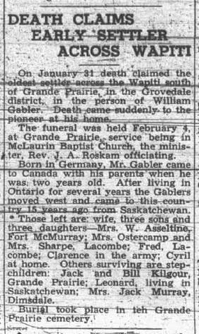 This month’s Country Roads heads to Grovedale for an account of the first homesteaders south of the Wapiti River. William Gabler had spent part of the winter of 1928 trapping in the area and was so impressed with the country that he returned to Rama, Saskatchewan and persuaded two other families, the Camerons and the Murrays, to join him in establishing a farming settlement. In the 1929 article, the area is not called Grovedale yet, but by 1943 when Mr. Gabler died, it had become the name of the district.