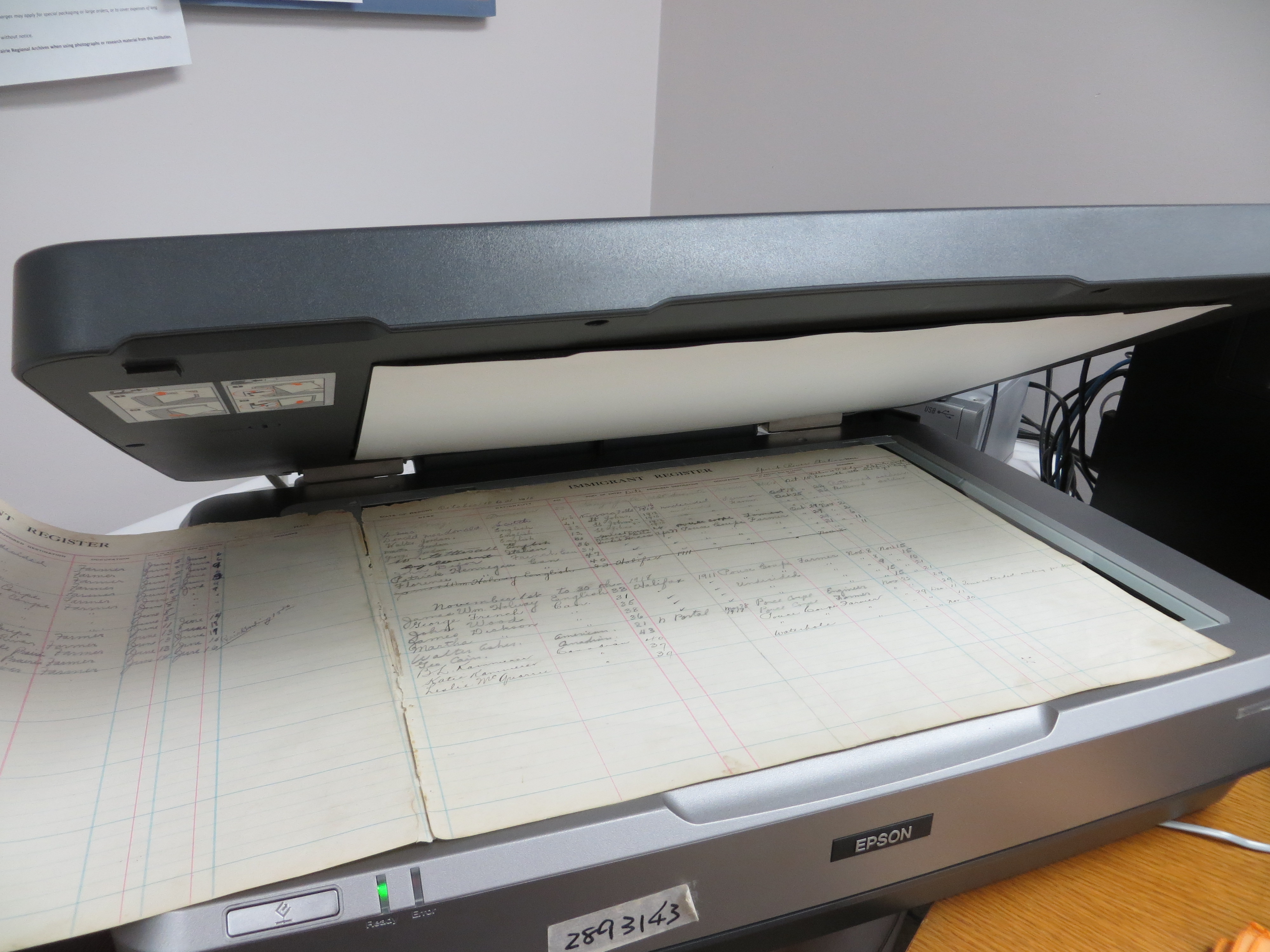 Our suggestion was that we could scan the registers, providing them a copy and the pages enclosed in sheet protectors. The whole thing turned into a binder for museum guests to look through, eliminating the worry about the originals. South Peace Regional Archives could safely store the original books in our temperature controlled storage room. They quickly agreed, and so we got busy!
