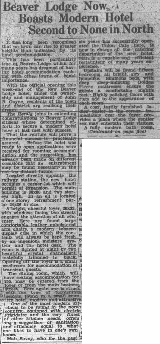 According to the writer of this article, a modern hotel is the dream of every town, and for many years Beaverlodge had longed for this amenity. Seems a bit dramatic! Nevertheless, a modern new hotel with a restaurant, refreshment parlors, large foyers, fifteen rooms, and a fully modern bath room with hot and cold running water would have been an asset to any community.