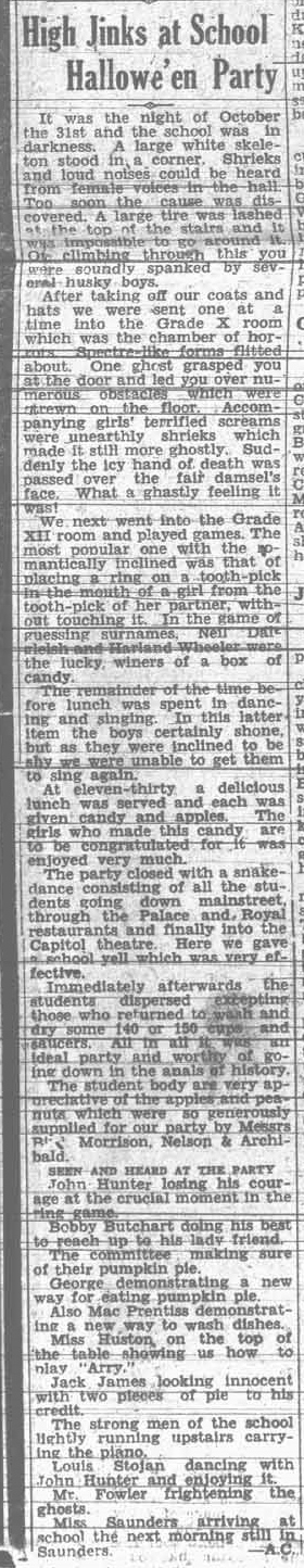 It sounds like the Halloween party at the local high school in 1933 was quite an event – a haunted house tour, games, dancing, and singing, then lunch. The party closed with a snake dance downtown, which to me would have been the most exciting part.