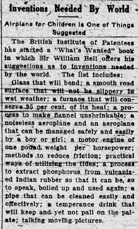 This list of inventions needed by the world is a bit odd, with some fairly practical suggestions as well as some strange ones – why would the world need an aeroplane that could be managed easily by a youngster? Many items from the list do exist now, such as highly efficient furnaces, bendable glass, and talking movies, which were introduced the same year this list was published.