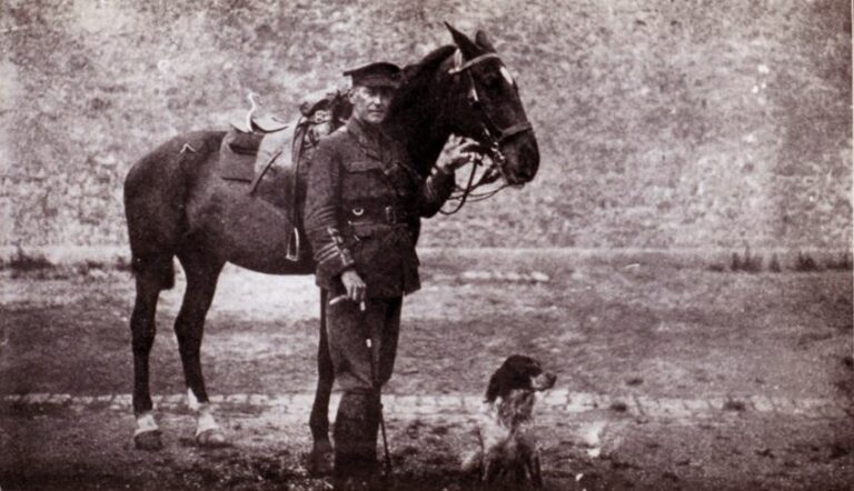 John McCrae, writer of “In Flanders Fields,” stands beside his horse, Bonfire, and his dog, Bonneau. The dog would often accompany McCrae as he tended to wounded soldiers.