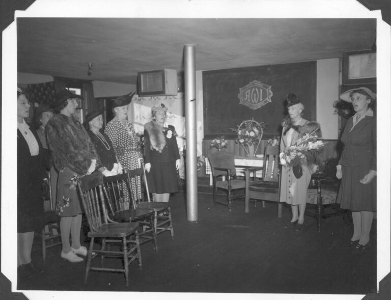 Photograph: Singing “O Canada” (SPRA 152.02.02.06) Women’s Institute constituency members singing “O Canada” in the basement of St. Paul’s United Church in Grande Prairie during the visit of H.R.H. Princess Alice in 1943. Included in the photo are Mrs. D. W. Patterson and Mrs. J. Smart of Grande Prairie and Mrs. L. Williams of Rio Grande