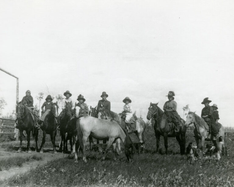 The caption on this photo (SPRA 0032.08.08.0459) describes it as “a group of nine Aboriginal people, including men, women, and children, on horseback.” This photo is part of the Campbell fonds; Isabel Campbell was a local historian who was very dedicated in preserving the history of Grande Prairie.  She collected many photographs that document the history of Grande Prairie across many topics.