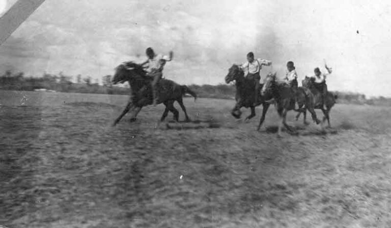 This photo (SPRA 0056.01.003c-2) is captioned “Indians Racing, July 1st 1910” at Saskatoon Lake Sports Day.” This photo is part of the Harry Tuffill fonds; it was taken by Harry Tuffill while he was in the Peace Country with Walter McFarlane’s survey crew. Our records do not identify the people in this photo, so if you may know who they are or have other stories about local Indigenous entertainment we would love to hear it! Please contact us at info@southpeacearchives.org or 780-830-5105.