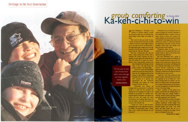 This item is an article from the magazine “Legacy” about Indigenous people reconnecting with their culture and spirituality after Residential Schools stripped them of it.  There are stories of a few different people talking about Ka-keh-ci-hi-to-win Gatherings (Group Comforting in Cree) in their community helping them heal.  The photo is of George Amato, Jodi Bork, and Bryn Podolchuk; George Amato is an elder in his community.   He said in the article “we care about each other in this group.  And that’s how my people were.  They Cared. If they had one last piece of meat, they’d be sure to share half with you.  They made offerings of thanks when they killed an animal.  They took time to laugh and sing together.  That’s what we’re doing here.”