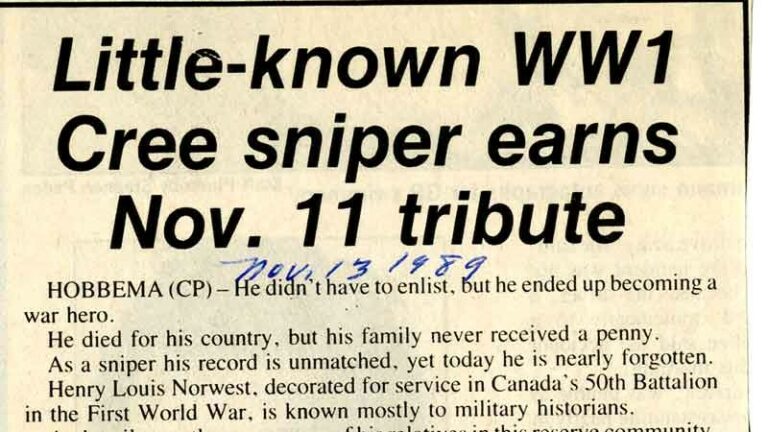 This featured item is from the Indigenous News reference file.  It is an article about Henry Louis Norwest, an Indigenous WWI veteran who had more confirmed sniper hits than any other soldier from countries in the British Empire. Norwest was born in Fort Saskatchewan in 1884 and enlisted in January of 1915.  He had 115 confirmed sniper hits, which means they were observed by another soldier.  He earned four medals for this achievement.  Another soldier described Henry Louis Norwest as being charismatic and quick witted.  Norwest died August 18, 1918 as he was about to pull the trigger on an enemy sniper when a bullet hit him just below his steel helmet.  He is buried near Amiens, France, which is north of Paris.