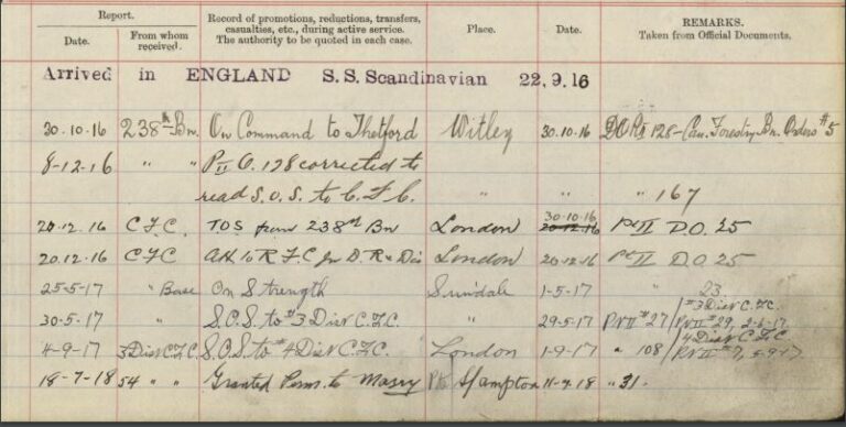 Image: A page from Harry’s military service file, indicating at the bottom that he was “granted permission to marry” in July of 1918. (Library & Archives Canada)