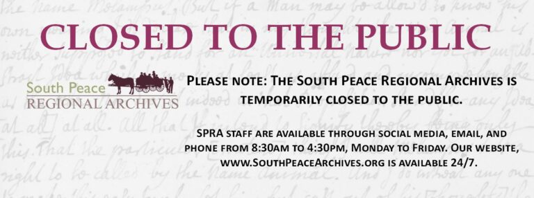 While the South Peace Regional Archives remain closed to the public, our staff have been hard at work completing vital behind-the-scenes tasks to support our mission of gathering, preserving, and sharing the historical records of our region. Archives staff are also available via phone and email during regular business hours to provide remote research assistance. Thank you for your ongoing support!