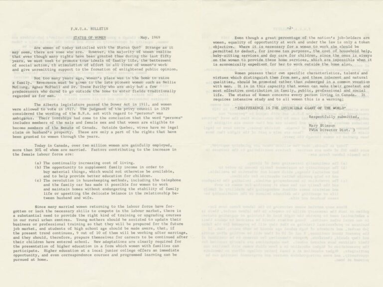 This artifact is a Farm Women’s Union of Alberta bulletin from May 1969 by Mary Stimson. In the letter she asks if women are satisfied with how the world treats them and raises issue with the rising costs of living, costs of childcare (which was needed as the rising cost of living meant many women with families now had to work outside the home), and supporting further practical education for women to make it easier to pursue careers. She ends the publication with a quotation: “Indifference is the invincible giant of the world”