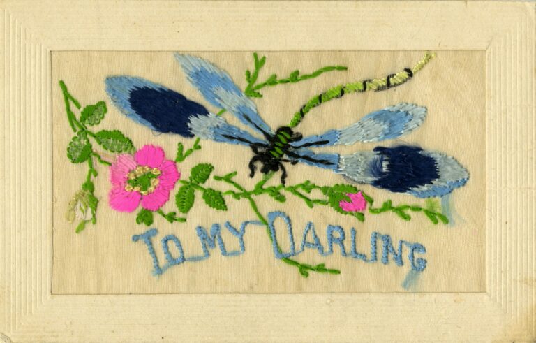 Embroidered silk cards existed as early as the 1900 Paris Exposition, but they soared in popularity during the First World War. Machine produced cards were also in existence but their colours were never as bright and they never achieved the popularity of the hand-stitched cards. The last known production of hand-embroidered cards was in the mid-1920s.