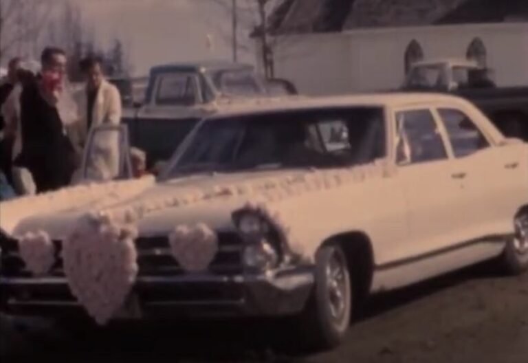 Image: A film still showing a bride and groom’s car (SPRA 0253.01.01, Fonds 253: Jerry Stojan family fonds)