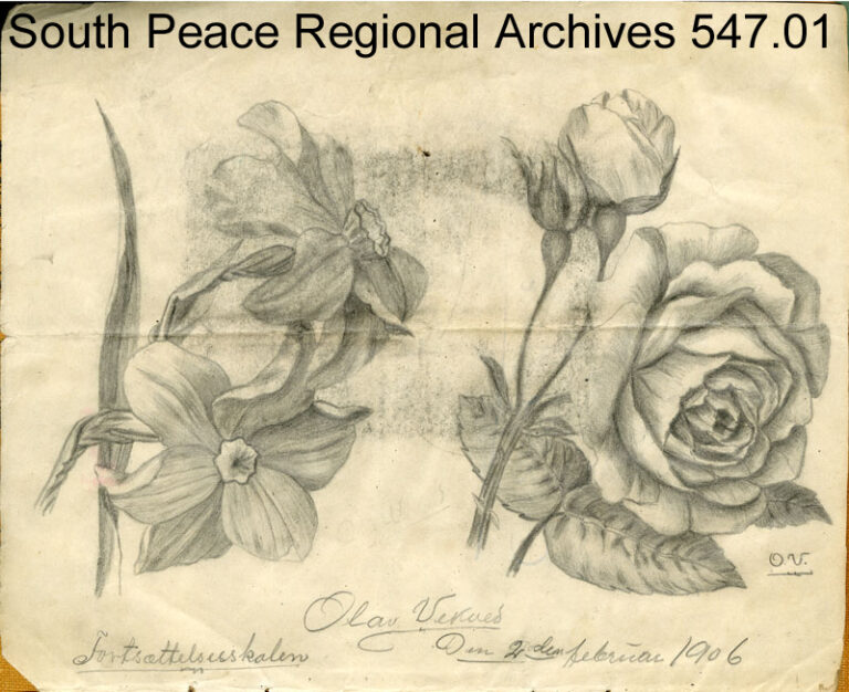 Olaf Vekved (Wekved) was born in Norway, and came to Canada in 1910. He arrived with his brother George and settled at Tofield, Alberta, where another brother, Ingebrigt, had settled in 1909. In 1913, George moved north to the Peace Country. Olaf followed in 1915, but chose land further north, on NW 5-75-8-W6 in the Northfield area, where a number of other Norwegian families were settling. They were joined that same year by brother Ingebrigt, who had skied up over the Edson Trail, and filed north east of La Glace. In 1924-1925, Olaf’s father, and then the rest of the family, also arrived from Norway and settled in the La Glace district. It appears that Olaf never married. From the records, we see that he was a gifted artist. He farmed in the Northfield district until ca. 1960. He died in 1969, at the age of 82, and is buried in Norden Cemetery, 1 mile east of La Glace.