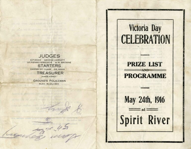 A program from Victoria Day Celebration in Spirit River May 24, 1916. The program includes a list of event that were held like the Ladies’ Fifty Yard Dash or “Putting the Shot”. The judges for the event were listed as A.P Shaw, George Garnett, St. Pierre Ferguson, W.W. Browne. The Starters were Barney St. Clair and Dr. Shaw. The Treasurer was James Fahey, and the Ground’s Policeman was Alex. McGilvary.