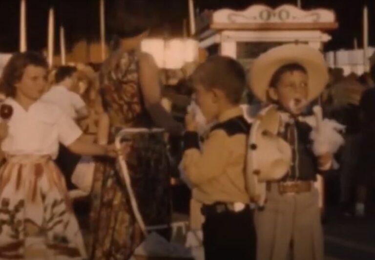 The Fosters visited Arizona in 1956, this time with four children in tow. Over the course of their trip, they visited many attractions in the Phoenix area, such as Montezuma Castle, Organ Pipe Cactus National Monument, and the Tumacacori Spanish missions complex, established in 1691. Though the landscape seems dry and unforgiving in many scenes, we also see the family admiring flower fields in full bloom and picking luscious fruit along the way. The heat did not keep the Fosters from enjoying themselves as they embarked on hikes and picnics and attended a local carnival and parade. The parade would have felt quite familiar to the children, as parades were popular community events back home as well (and were often considered a spectacle worth filming). Like Grande Prairie parades, the one in Arizona included marching bands, floats, and people on horseback.