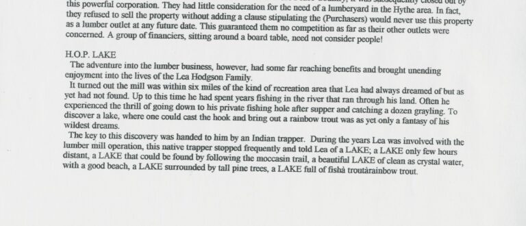 This textual record describes how Lea Hodgson and his father John left their farm in Hythe to create a lumber mill on the Cutbank River. It goes on the detail the history of the Mill. The second section in this document is called H.O.P. Lake. This section describes how Lea and his friends “discovered” H.O.P Lake (later, One Island Lake). According to the story, the key to the discovery was “handed to him” by an Indigenous trapper who frequently stopped in the area. The trapper had told Lea about a lake that “could be found by following the moccasin trail, a beautiful lake of clean as crystal water, with a good beach, a lake surrounded by tall pine trees, a lake full of [rainbow trout].” The lake was later surveyed by the British Columbia land offices and divided into private properties.