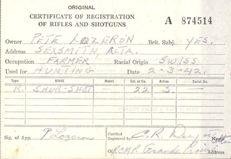 Today’s “From the Vault Friday” features a certificate of registration for a rifle from the Pierre Lozeron family fonds (Fonds 006). The gun, registered early 1942, was a .22 Shur-Shot single (?) action rifle that Pierre used for hunting. The certificate was signed by someone at the Grande Prairie RCMP detachment. At the time, it wasn’t required for the firearm to have a serial number, but it was unlawful to alter or deface numbers. During World War II, you had to register rifles and shotguns, but this was discontinued after the war ended.