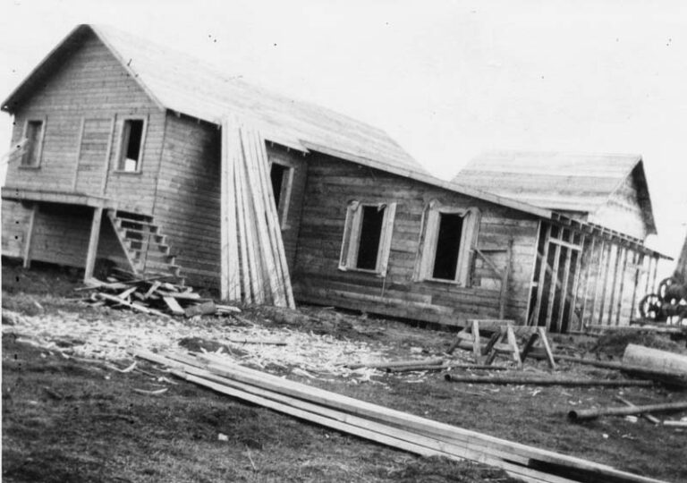 Image: Building of the Grande Prairie Creamery, with the ice house in the background. The creamery started operations in the fall of 1920. (SPRA 024.01.09.58)