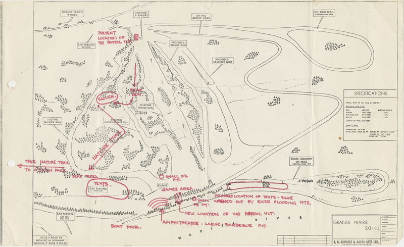In 1977, the Grande Prairie Ski Club requested funds from the Kinsmen Club to finance 50% of the cost to install snow making equipment with the intent to have man-made snow on the slopes for the 1977-78 ski season. The equipment was purchased; but it is unclear who provided the funding.