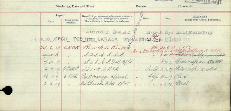 Image: Notes about Frederick’s military career from his military service file (Library & Archives Canada)