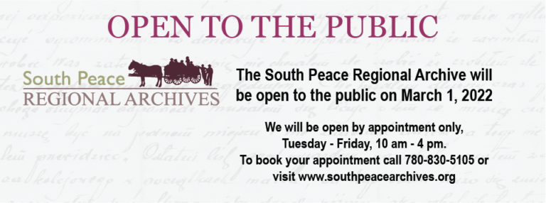 We are thrilled to announce that after two long years the South Peace Regional Archives is re-opening to the public. As of Tuesday March 1, 2022 the Archives will be open by appointment Tuesday to Friday, 10 am to 4 pm. The appointment system will help us to manage the capacity of the reading room, ensuring that every researcher has the space to work in comfort and privacy, and that staff are available to assist them. Appointments can be booked online or by phone at 780-830-5105.