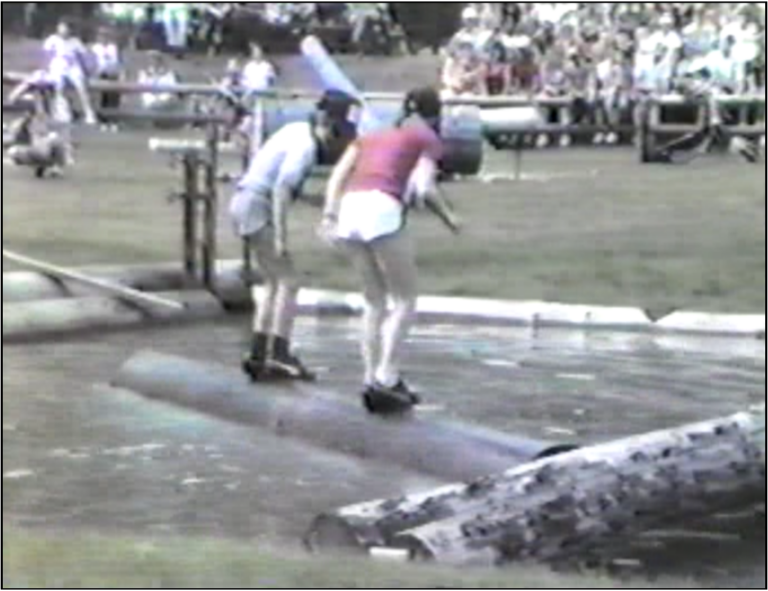 Image: Still from 1986 Grande Prairie Logging Sports. This video cassette shows various events, competitions, demonstrations and entertainment at the 1986 event. (SPRA 1998.22.03c) The still featured here shows a “birling” demonstration: a game wherein each player attempts to balance on a floating log while each rotate it with their feet.