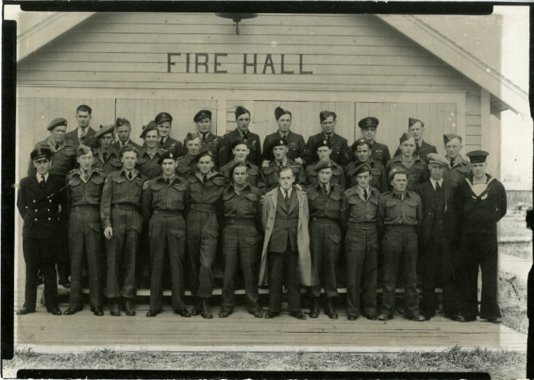 Image: The returning Sexsmith soldiers after WWII. Back – Bill Card, Dan Rycroft, Simon Haakstad, Jack Campbell, Andy Innes, George Cameron, Dale Harris, T. Copeland, Samuelson. Middle – J. Bond, G. Gerow, E. McDonald, G. Rix, Scotty Boyd, J. Siluch, Bryce Burns, L. Rasmussan, D. McNaughton, T. Forsythe Front – Jack Waters, H. Knight, B.Brown, L. White, C. Foote, C. Thomson, D. Wright, B. Murray, G. Kusyk, B. Moody, G. McQuitty, J. Thorpe. Photographer’s stamp: Art Craft, Grande Prairie, Alta. 1945 (SPRA 644.01.08)