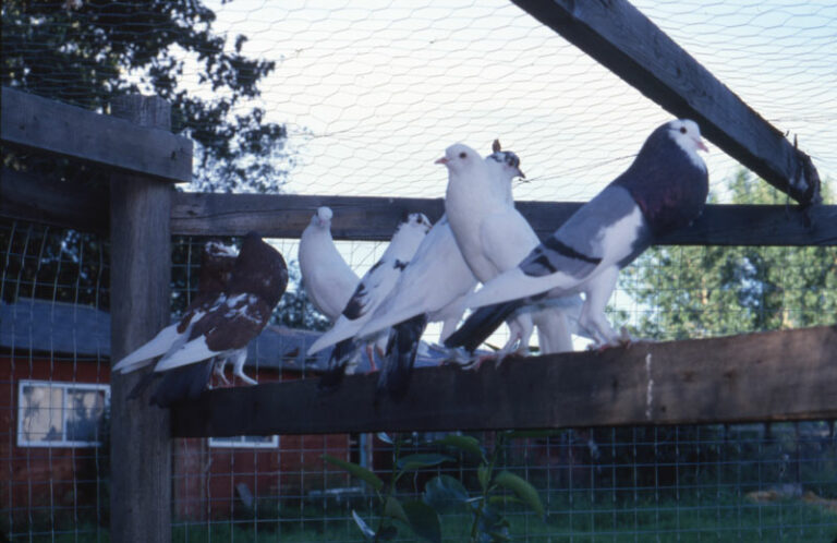 Image: Pigeons of several varieties in a pen, part of Vince Durda’s collection of exotic birds, July 1979 (SPRA 002.05.06.524)