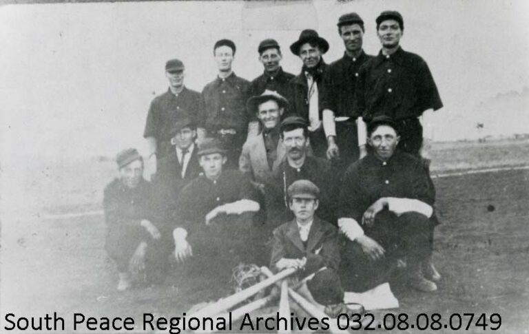 Image: The Lake Saskatoon Baseball Team in 1912. Standing: Leonard Eisenmann, Charlie Richardson, George Stoll, Charlie Stoll, Sel McAusland, and Max English. Seated: Roy Stokes, Dean Hodgins, Percy Perraton, Ulia Douglass, Walter Eaton, Hermann Reidrick, and Jimmy Loudfoot, bat-boy. (SPRA 032.08.08.0749)