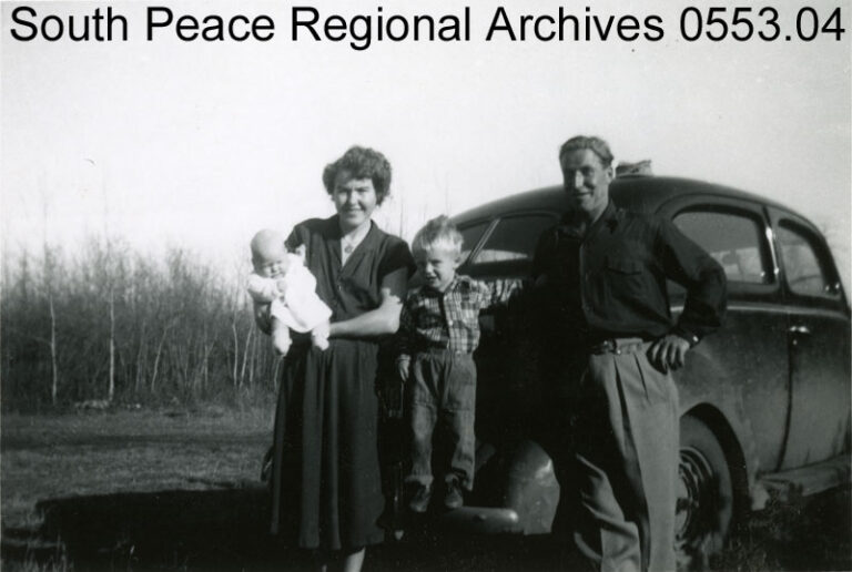 Arnold Dryer, born on August 24, 1914 in Hanna AB, was one of 9 children of John and Margaret Dryer. In August 1931 he moved with his parents and siblings to the Peace Country by train, and they settled in the Glen Leslie area. For a few years Arnold helped neighboring farmers with threshing and other farm work. Around 1934 for 3 summers, he made the Stampede Circuit in Debolt, Wembley, Beaverlodge, Dawson Creek, Rycroft, Peace River, and Grande Prairie. In 1937 he started work for Pete Donahue, being a “jack of all trades”, until he joined the army in June 1940. He enlisted with the Southern Alberta Regiment in Grande Prairie and served overseas, where he was married to Violet from Farnham, Surrey, England, on August 23, 1945. Violet was in the W.A.A.F. in England. After his discharge in January 1946, Arnold returned to Canada, and his wife sailed to Canada, arriving in Grande Prairie on July 4, 1946. The couple had 3 children: Dale, Mark, and Ann. Arnold died at age 63 on November 28, 1977 in Grande Prairie, and was buried at the Grande Prairie Cemetery. (Arnold’s brothers Robert, William, and Dave also served in WW II, and his brother Jack served in the Korean War.)