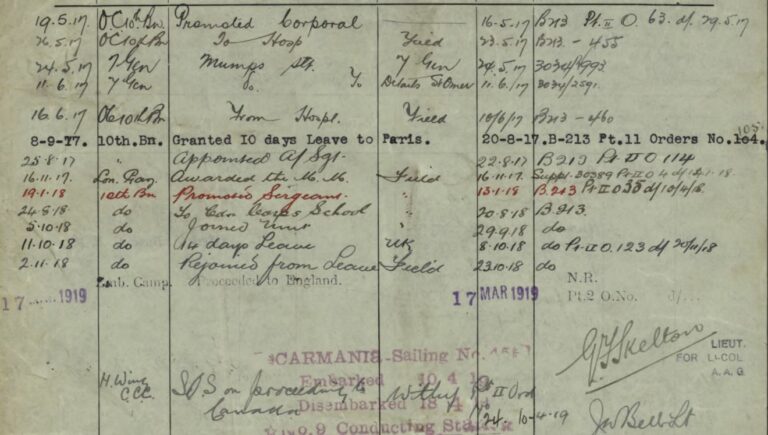 Image: Notes from Andrew’s military service file (Library & Archives Canada)