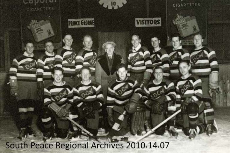Image: “D” Company Hockey team which played for the 1949-1950 team included, back row: Wilf Blais, Bill Blais, Harley Patterson, Cliff Wright, Coach Ernie Ayers, Bob Kelly, Don Swanston, Bob Neufeld, Ernie Nelson. Front row: Walter Hiekkla, Bill Bessent, Bobby Pearson, Oscar Blais, Unknown. 1949-1950 (SPRA 2010.14.07)