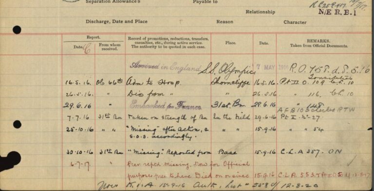 Image: Notes from Cecil’s military service file (Library & Archives Canada)
