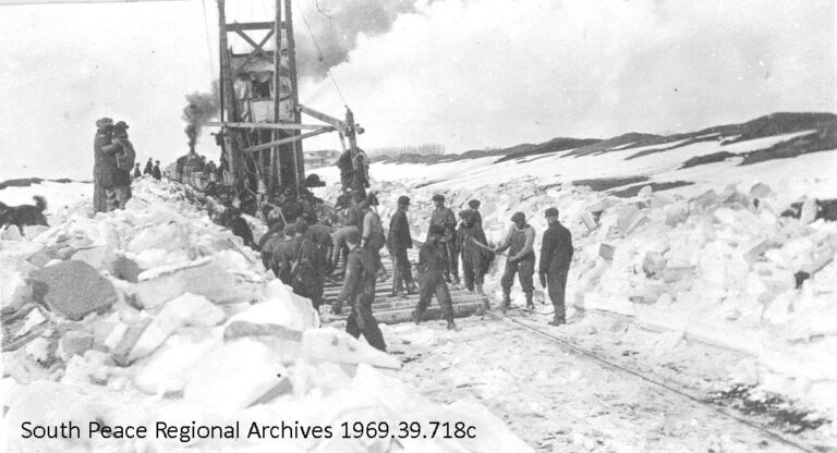 Image: Winter construction of the railroad track for the Edmonton, Dunvegan and British Columbia Railway into the Grande Prairie area, ca. 1916 (SPRA 1969.39.718c)