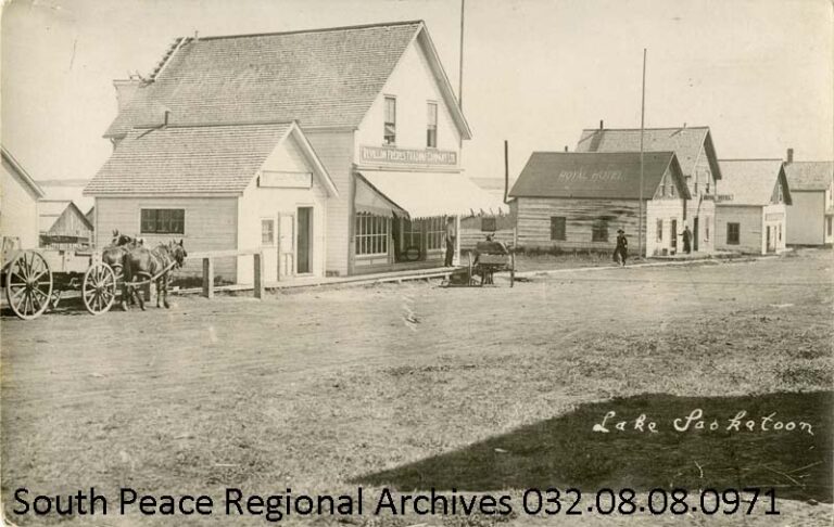 Image: A view down the main street of Lake Saskatoon showing businesses including the Revillon Freres Trading Company Ltd. and the Royal Hotel, ca. 1916 (SPRA 032.08.08.0971)
